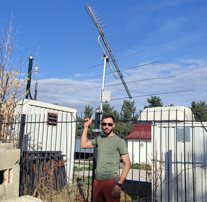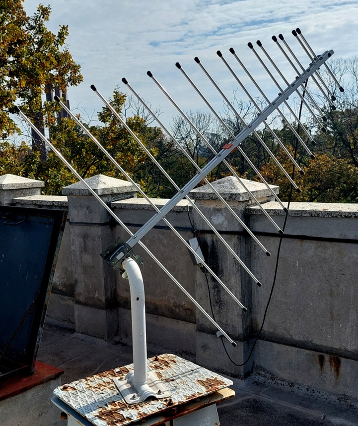 Logarithmic periodic dipole antenna LPDA. Observations 45 MHz - ~400 MHz, horizontal polarization with antenna tracker. Operated by: Marko Radolović File-ID = Croatia-Visnjan |