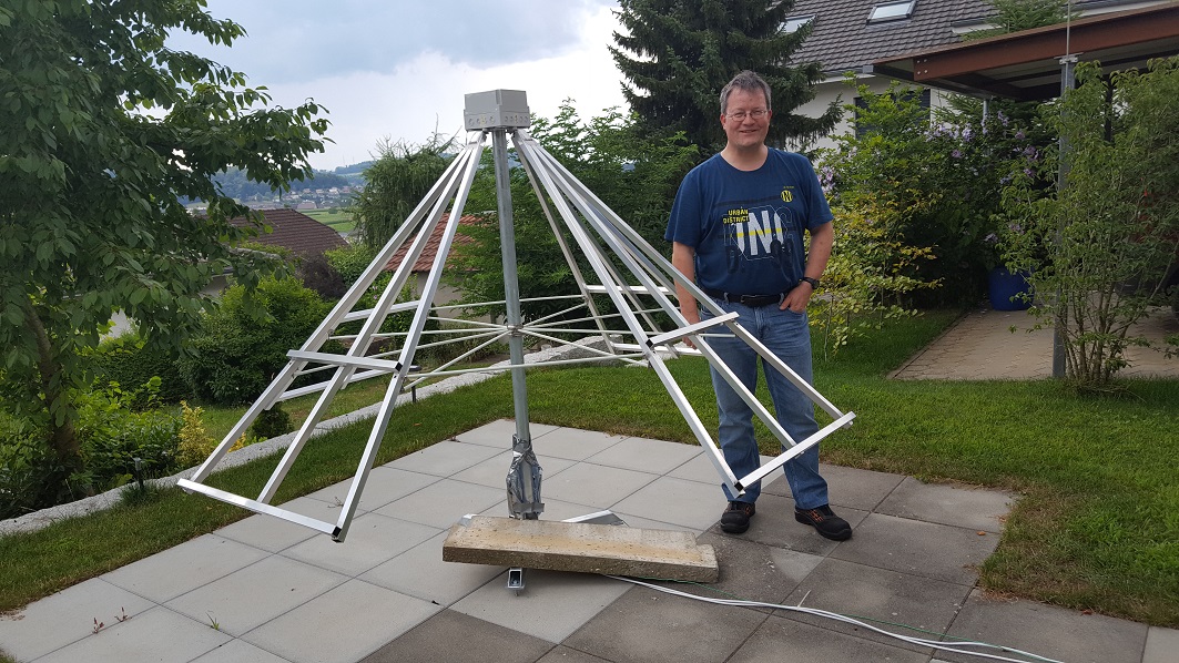 Observatory Hirt, Muhen Switzerland File_ID = SWISS-MUHEN LWA-Antenna (in the back) is home built by Peter H., Muhen Both linear polarizations of LWA are converted into circular polarization. Also an up-converter is installed to observe down to ~15 MHz LWA-FEE and LWAPC-Q were procured from Reeve, Anchorage. LPDA with rotator is observing 45 MHz - 870 MHz Operated by: Peter Hirt |